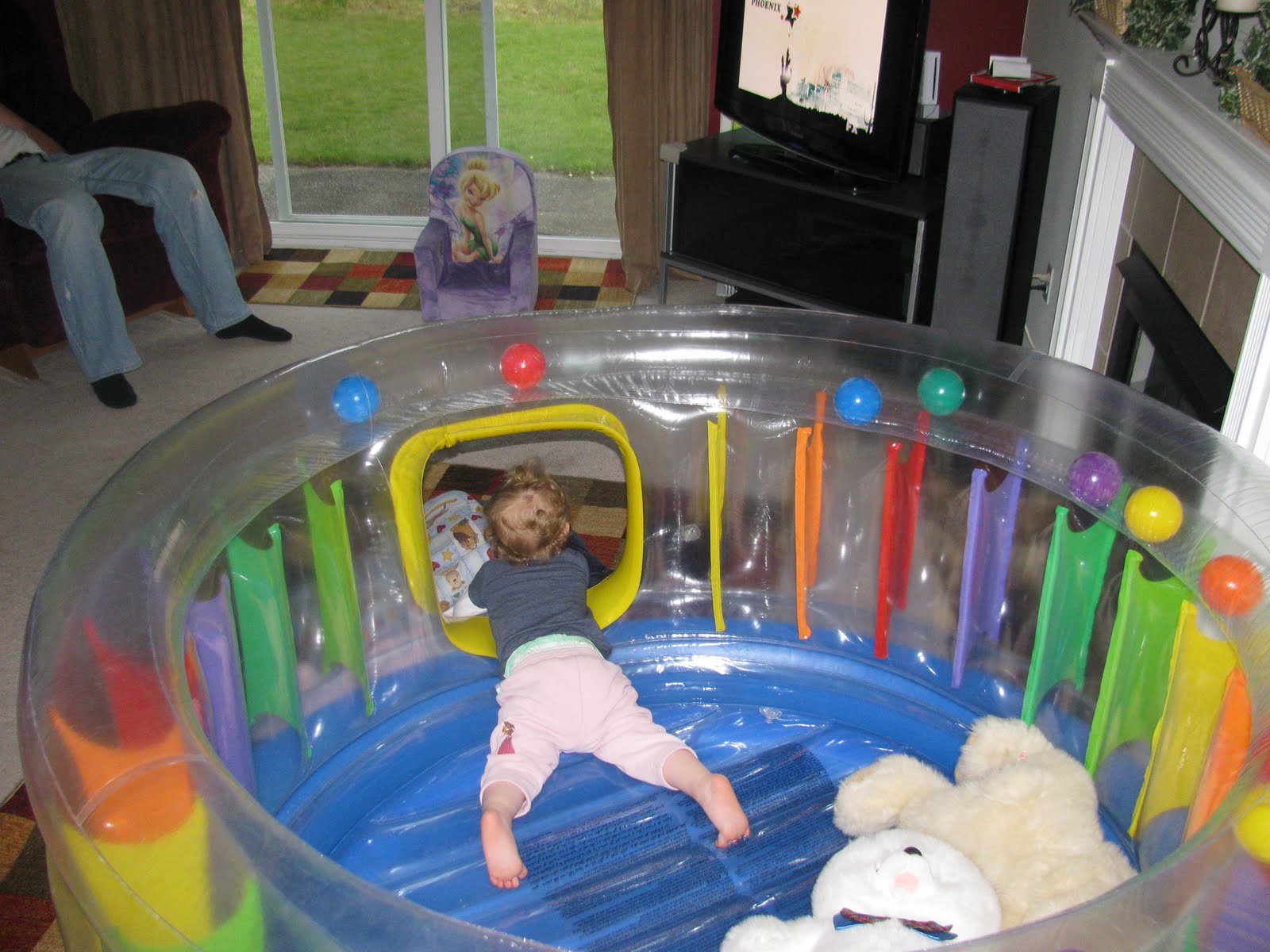 So we got Hailey this super, duper, ultra fun bouncy house thing. She lives in it. It has been a great investment and not expensive at all because we shop at ghetto